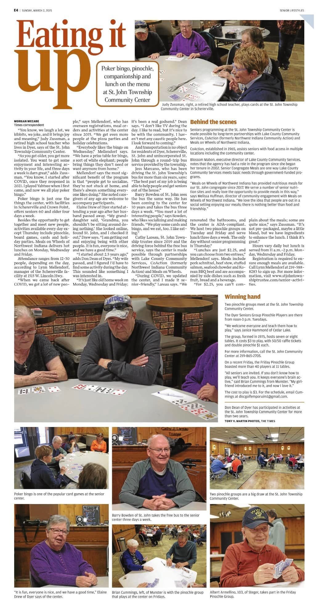 While participating with the Senior program, residents can receive transportation to and from the community center for the seniors of St. John Township. With a suggested donation of $2.25 each day, seniors can enjoy a catered hot lunch. Please note, reservations for new clients must be made two days in advance. For more information on becoming a member, or to make a reservation for lunch, please call (219) 663-0627.